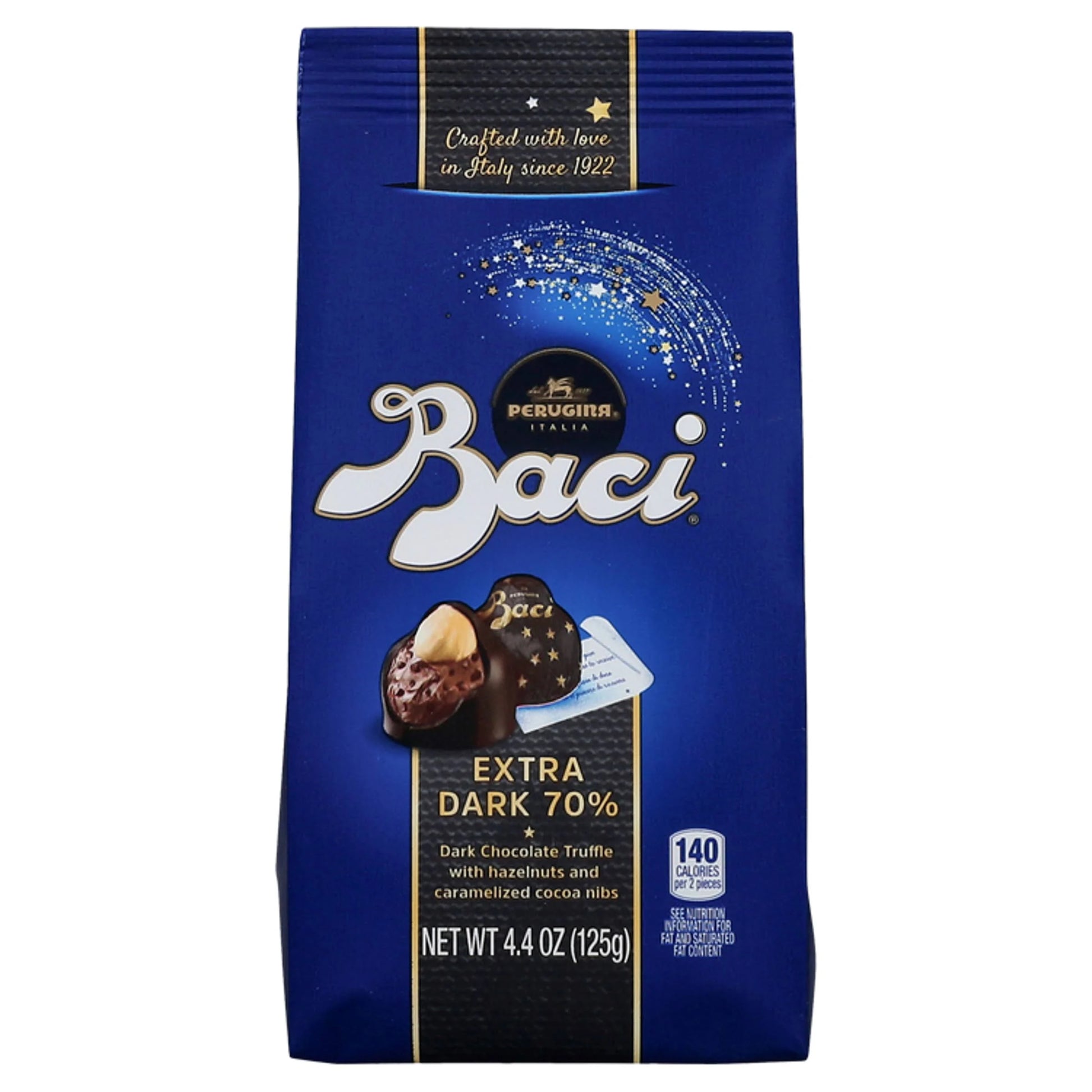 Baci Perugina, Extra Dark 70% Chocolate Truffles, An Italian expression of love and affection wrapped in chocolate. BACI PERUGINA Extra Dark 70% Chocolate Truffles are an intense harmony of luscious cocoa and hazelnuts blended with cocoa nibs, crowned by a crunchy whole hazelnut, covered in fine extra dark chocolate 70%. Each uniquely shaped BACI chocolate conceals a Love Note to inspire and express the emotion of love.